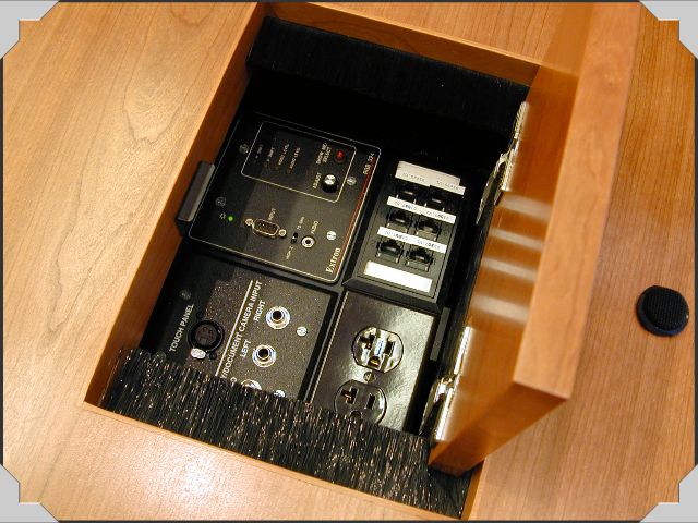 Access panel in table-top. Hinged door is slightly smaller than its opening, with brush strip filling the gap, permitting cables to pass through with door closed. That's a microphone to the right.