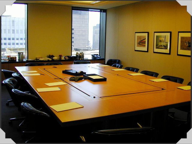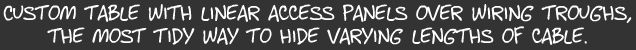 Home Custom table with linear access panels over wiring troughs, the most tidy way to hide varying lengths of cable.