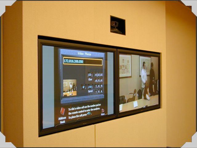 Home Small videoconference room. Flat-panel displays set into wall, videoconference camera above.