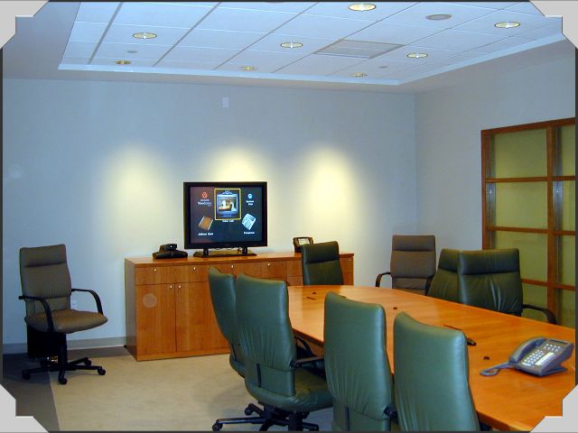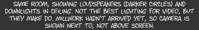 Same room, showing loudspeakers (darker circles) and downlights in ceiling.